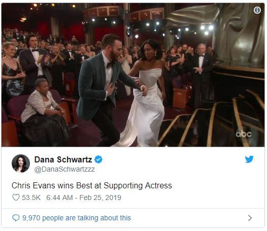 King, who was wearing an Oscar de la Renta gown was supported up to the stairs by Chris Evans when she went on stage to get her award, and internet cannot have enough of his genteel attitude.
