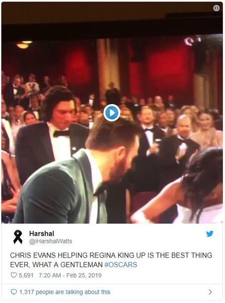 Popular American Actress Regina King won the best supporting role award for ‘If Beale Street Could Talk,’ at the 91st Academy Awards. While that made headlines, what has bitten Internet crazy is gentleman Chris Evans assisting King up on stage when she won the award.